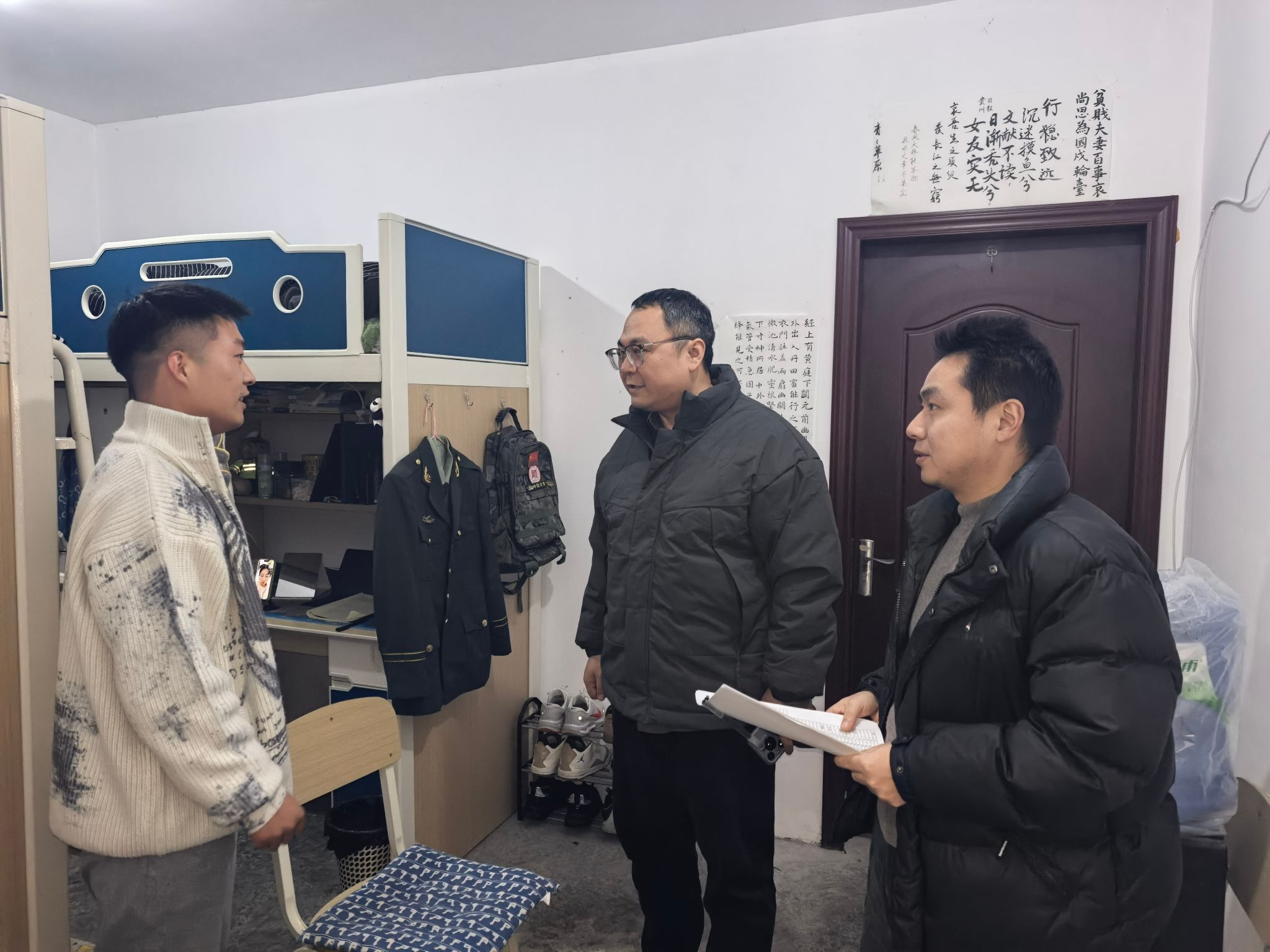 在走访中,院领导和辅导员还围绕宿舍消防安全、违规用电、防诈骗及内务卫生等进行现场检查,向同学们宣传安全防护知识,告诫同学们不要私拉乱接电线、违规使用大功率电器等,预防安全事故发生。